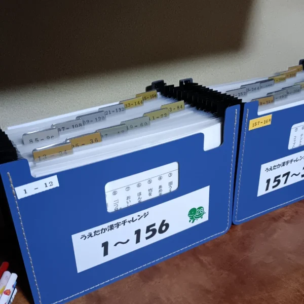 終わったプリントは、専用のファイルに番号順に綴じていきます。